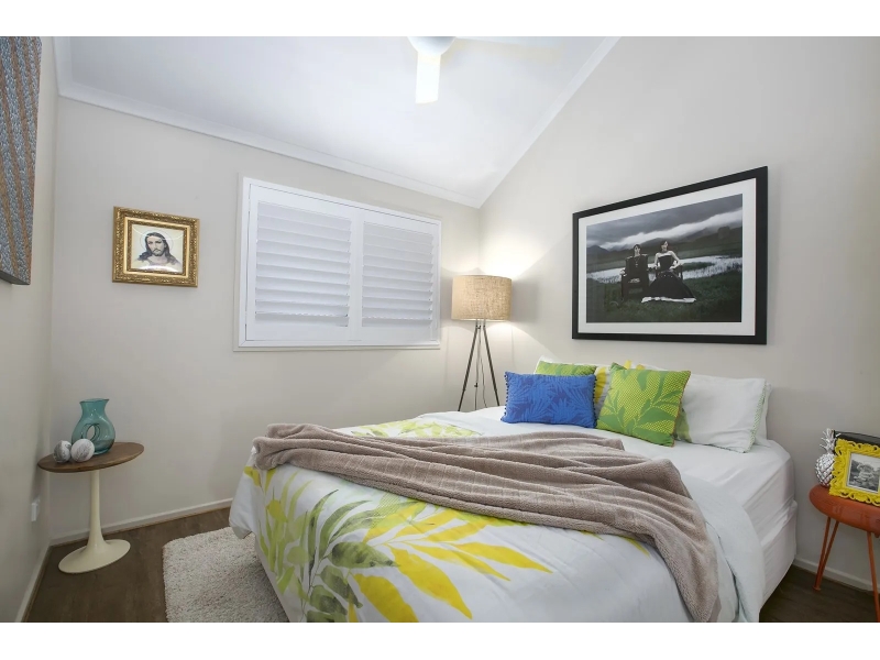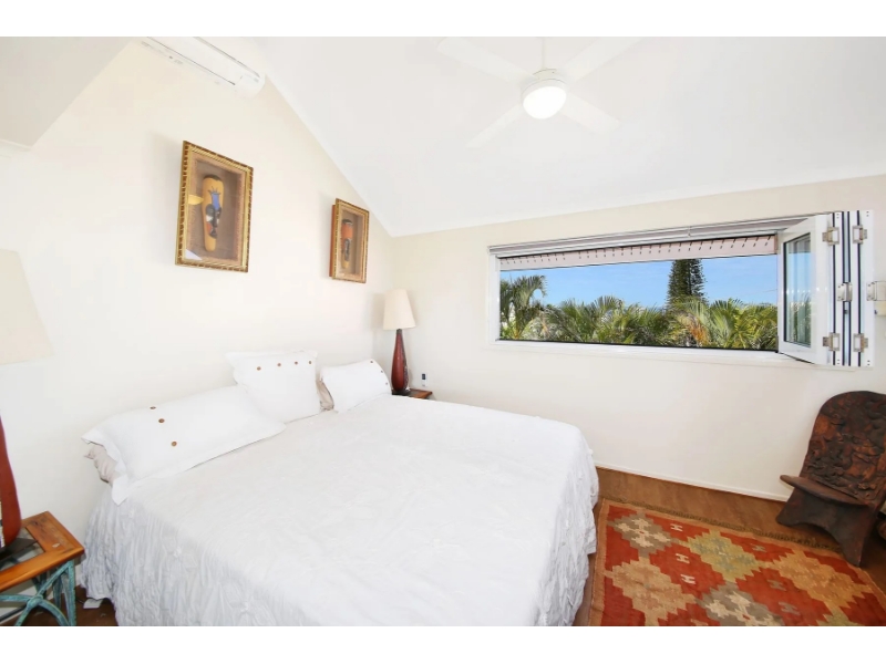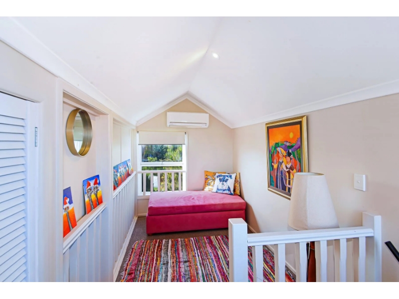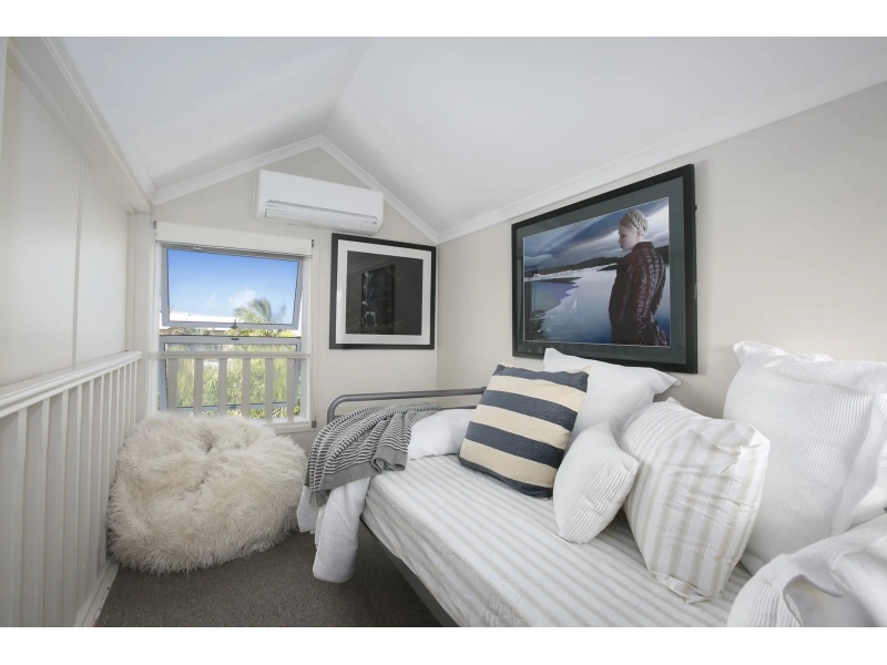 The master bedroom impresses with high ceilings, generous proportions, and abundant natural light, complemented by bi-fold windows capturing ocean glimpses. The second bedroom comfortably accommodates a queen bed, while the loft-style third bedroom, accessed via an unobtrusive spiral staircase, offers versatility and charm, ideal for guests or a creative retreat.
