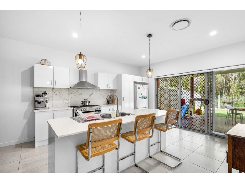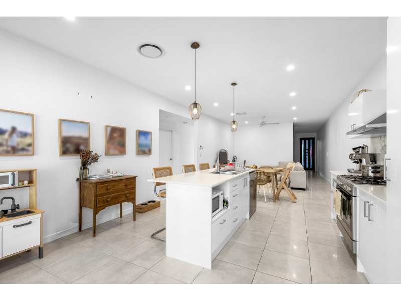 At the centre of the home, the kitchen, dining and living spaces come together in a way that invites connection. The kitchen is well appointed with stainless steel appliances, a gas cooktop and ample storage, perfectly positioned to remain part of the conversation whether you are preparing meals, helping with homework or entertaining friends. These open plan living zones extend seamlessly to a large covered outdoor patio, creating a natural transition between inside and out and offering the kind of extra living space that becomes part of everyday life.