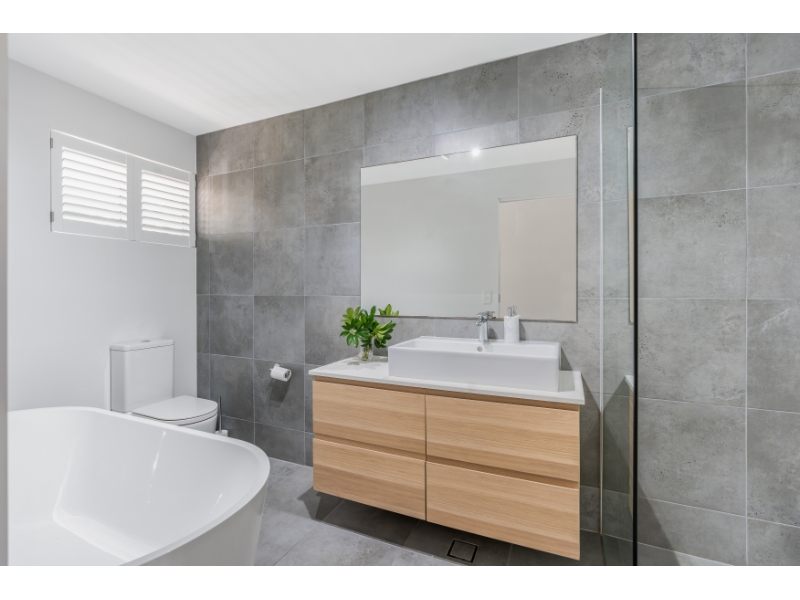 Modern bathroom features floor to ceiling tiles, freestanding bath and frameless shower