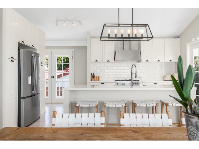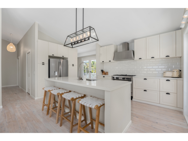 Hamptons inspired central kitchen features integrated dishwasher, stone tops, ample storage