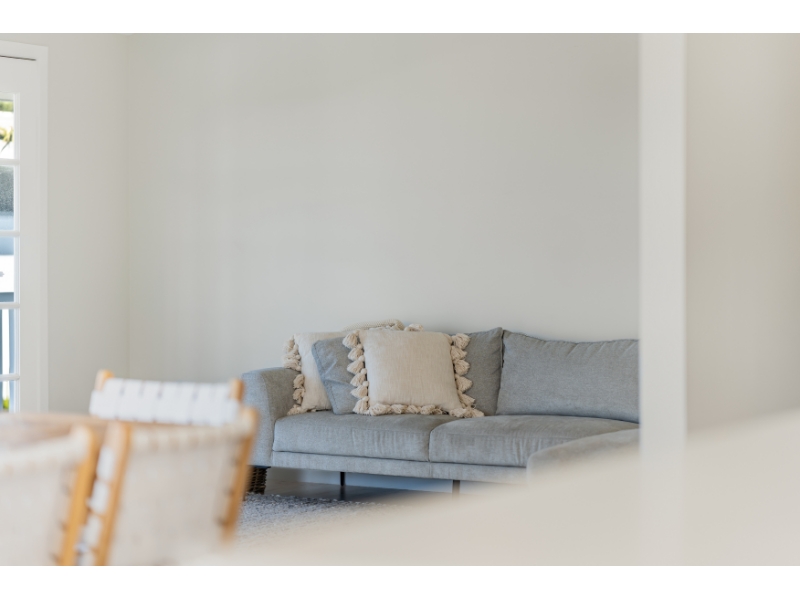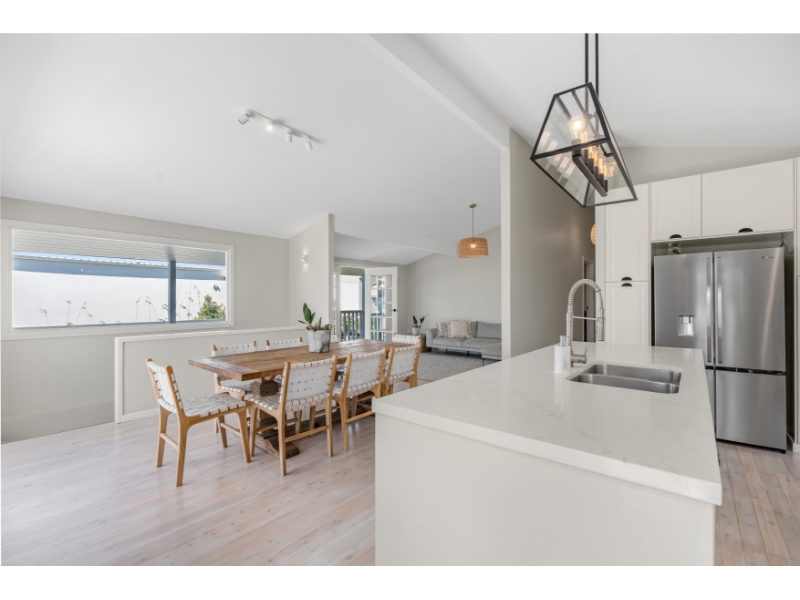 Whitewashed timber floors flow throughout the home, oozing with beach-side charm