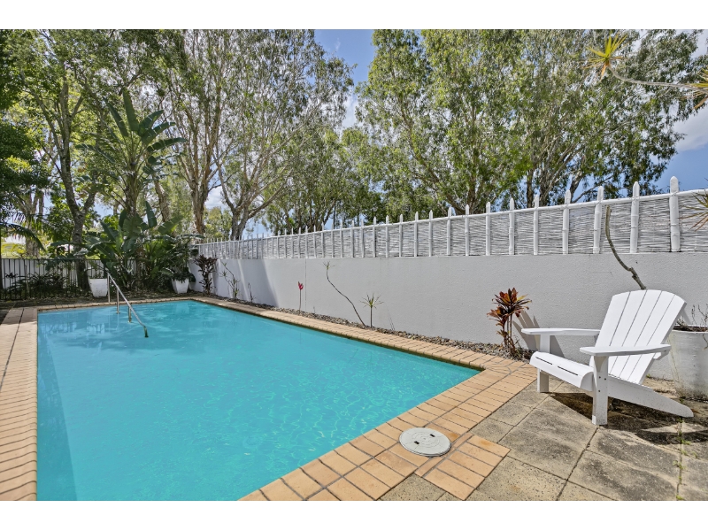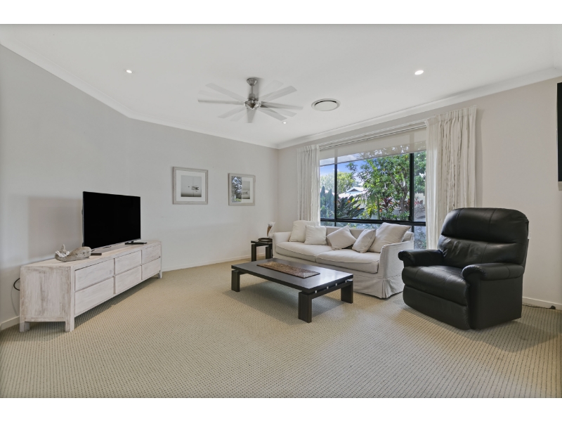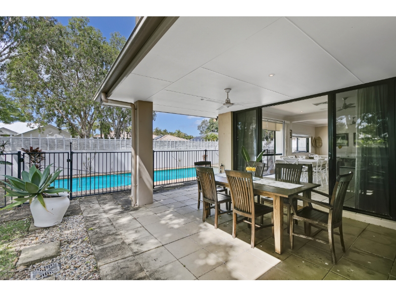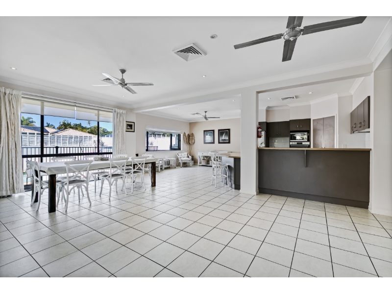 The floorplan flows seamlessly, with multiple light-filled living zones anchored by a central kitchen featuring a large island bench and breakfast bar. Indoors transitions effortlessly outdoors, where an inviting alfresco area overlooks the sun-soaked pool framed by tropical gardens – a perfect space for year-round entertaining.