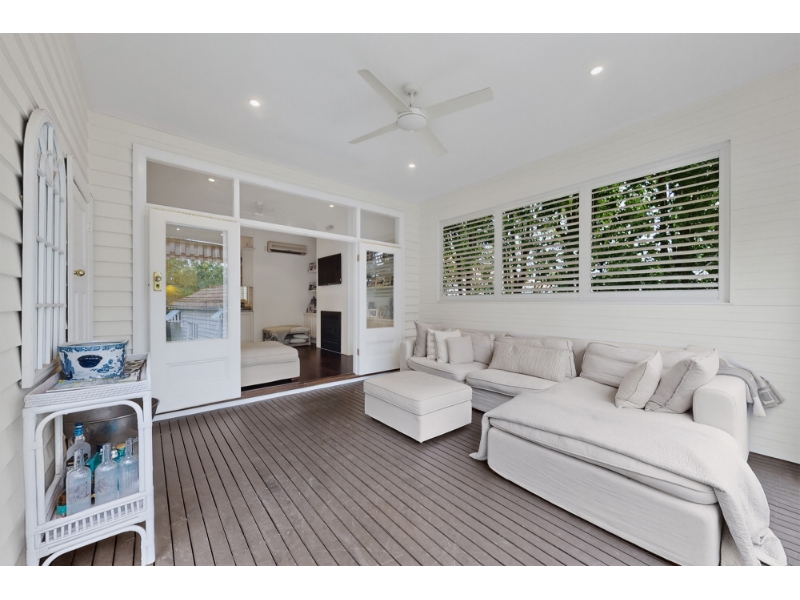 French doors opening to a rear deck alfresco area overlooking pool with a northern tree top aspect.