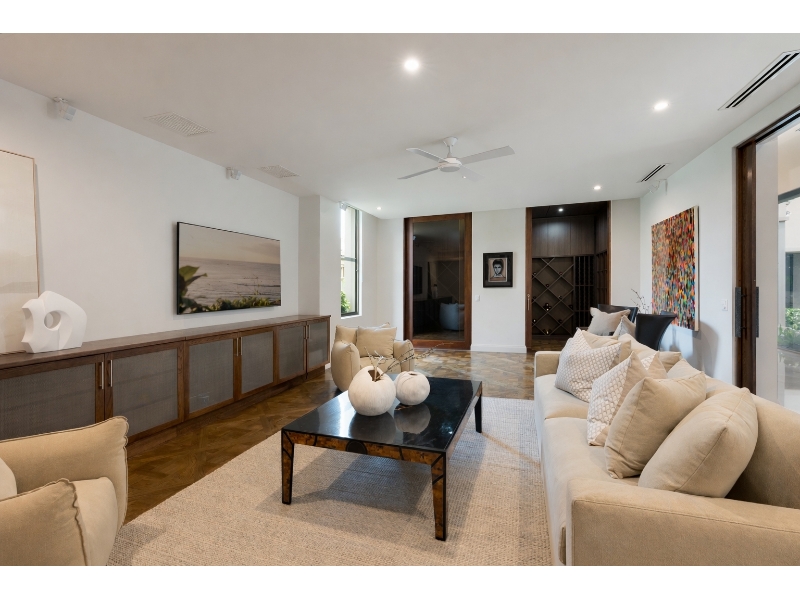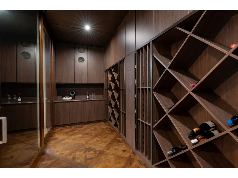 Private media room with custom wine cellar, complemented by a sophisticated executive office